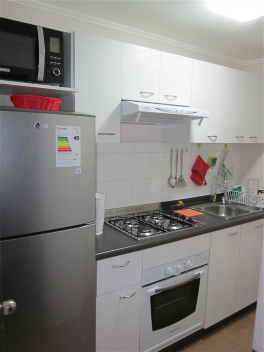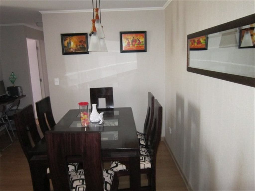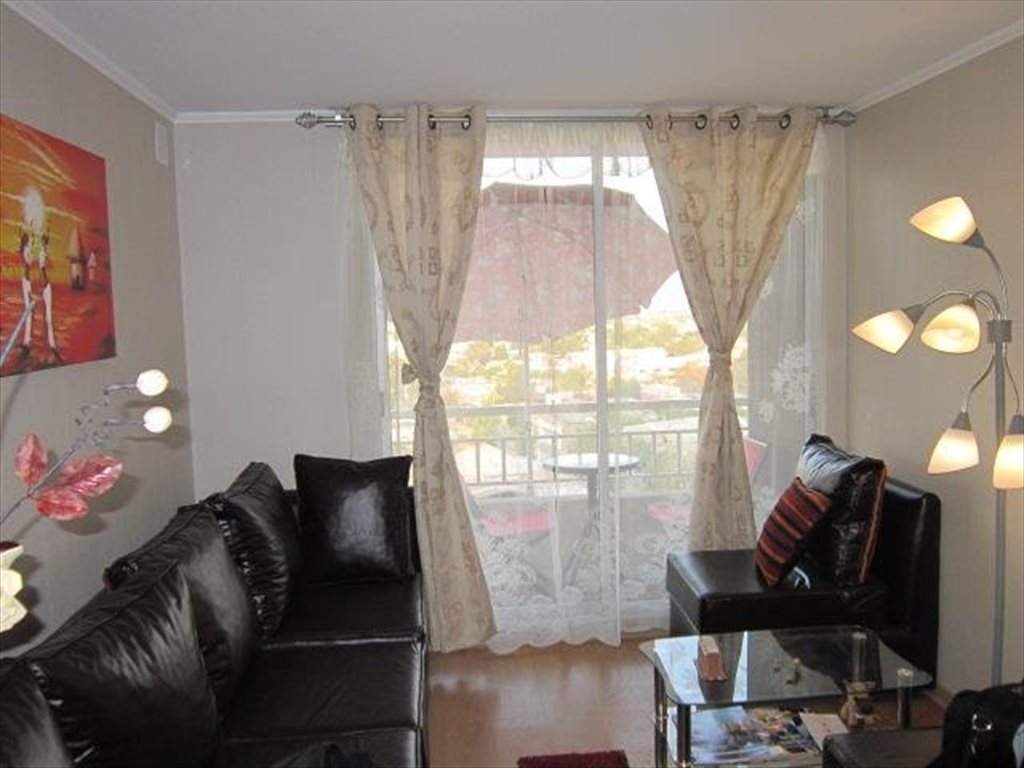 Características del departamento: 3 habitaciones, 2 baños, terraza con buena vista, logia, Living, sofá, comedor amueblado e iluminado, cocina tradicional cerrada y equipada, vajilla completa, refrigerador, microondas. Cada persona tiene asignado en la cocina su propio lugar privado de dispensas, también cuenta con estacionamiento de visita.