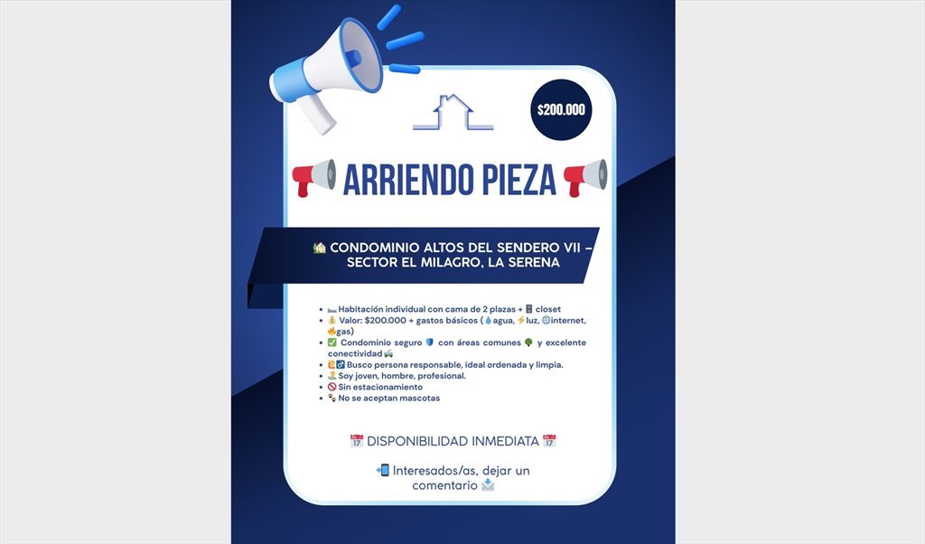 Arriendo de habitación individual en Condominio Altos del Sendero VII, Sector El Milagro, La Serena! 📍