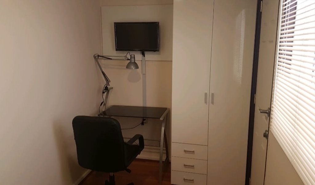Cuenta con: Cama, colchón de resorte de alta gama, ropa de cama (sabanas, almohadas, frazadas, cubre camas y plumón), closet, velador con lámpara de noche, bajada de cama, televisión Led de 19 pulgadas con TV cable con decodificador y más de 140 canales y Wifi de alta velocidad con Fibra óptica de 940 megas de subida y de bajada Ideal si haces teletrabajo o estudias.