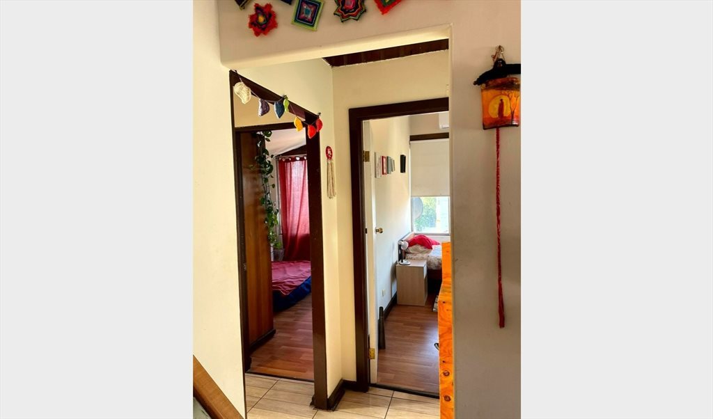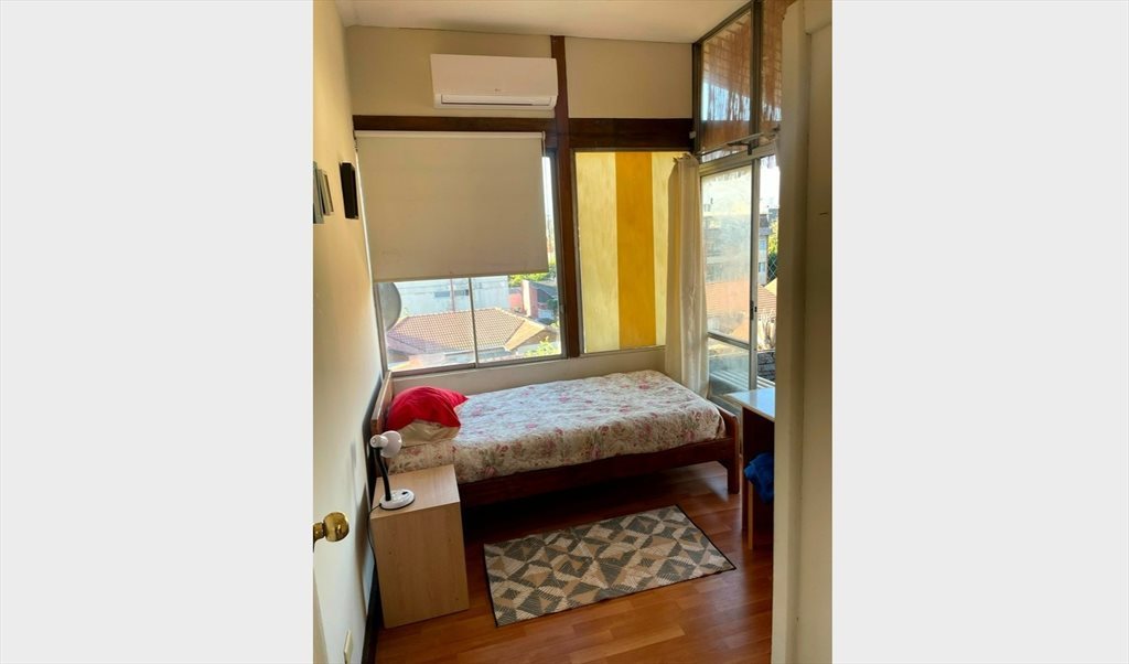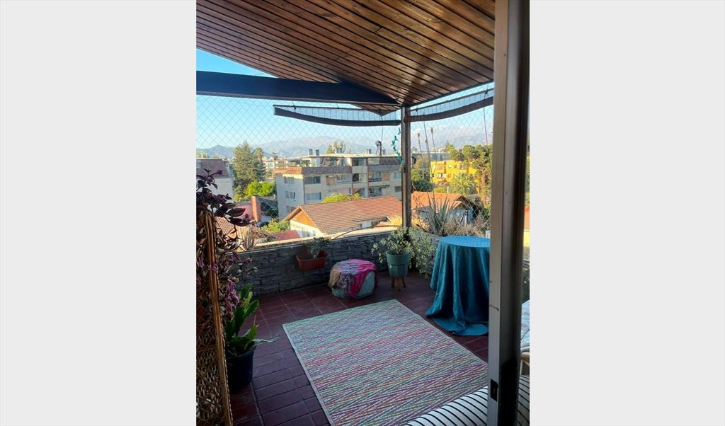 El Departamento cuenta con 2 dormitorios (uno para mi y uno para arrendar), 1 baño, doble terraza, con vista al este y oeste; amplio living-comedor, cocina independiente. Es una habitación disponible, amoblada (cama de 1 1/2, closet, escritorio, mesita de noche, lampara, silla, ropa de cama limpia y aire acondicionado) con baño fuera de la habitación de uso común. El departamento cuenta con una vista privilegiada de la cordillera y el ambiente cercano al edificio es tranquilo y seguro.