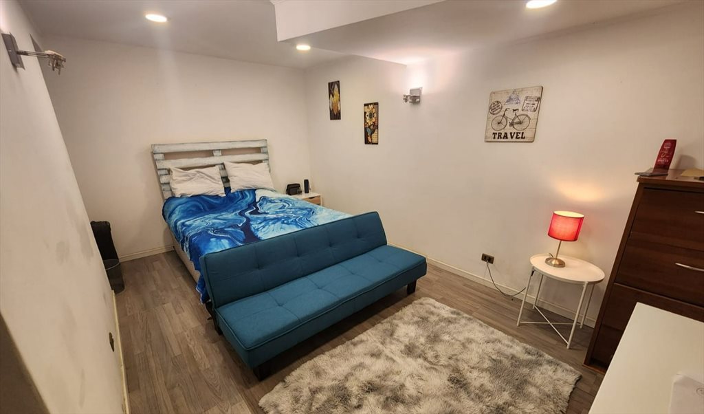 Habitación grande de 20 m2, con zona de dormitorio y otra para estudio. Cuenta con cama 2 plazas, velador, futón, 2 comodas, closet y escritorio. Es un home studio que esta ubicado en el subterraneo de la casa.