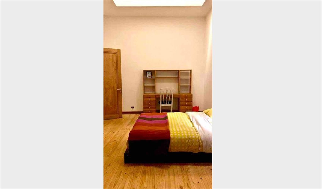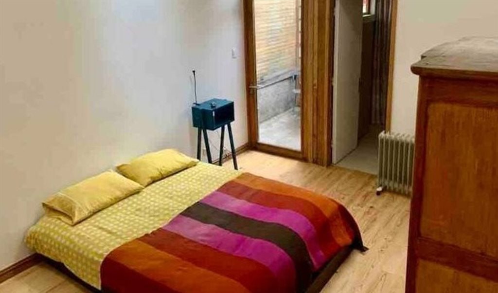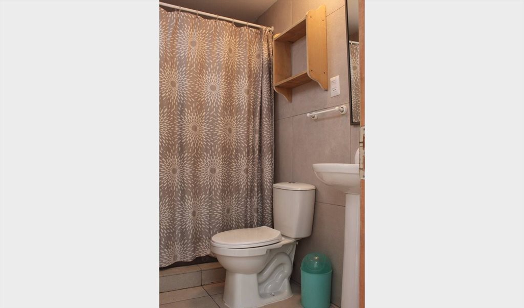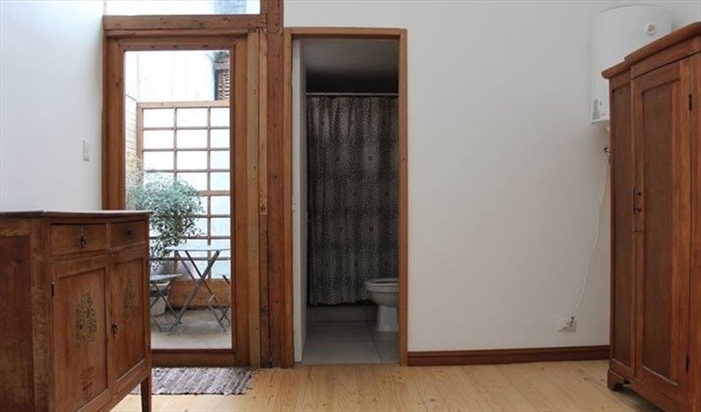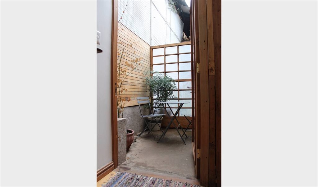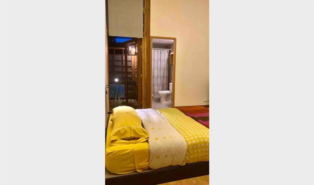 Pieza amoblada amplia y luminosa, piso de madera, doble altura, entradas de luz natural en el techo, tiene baño privado en suite y un pequeño patio.