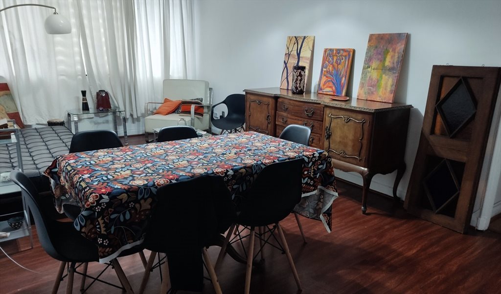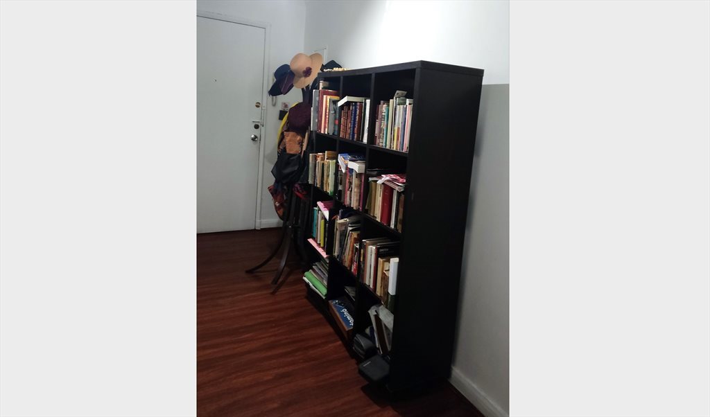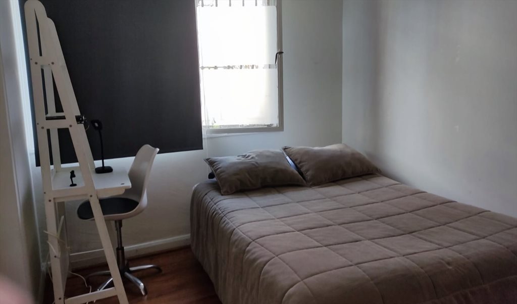 El apartamento es del año 65 y está en excelente estado, sus espacios son amplios, en total 120 metros cuadrados, un gran living, La pieza es de 10 metros cuadrados, está amoblada con un box spring de plaza y media, escritorio y silla. Respecto a la seguridad del edificio este cuenta con cámaras, solo tiene acceso con un pin personal.