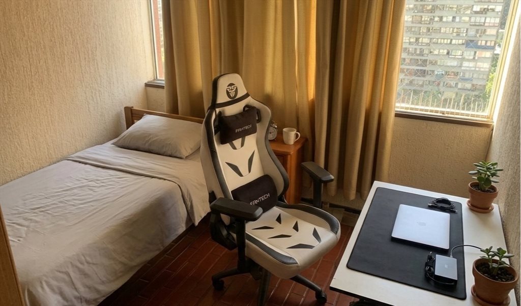 La pieza es cómoda y luminosa, el departamento cuenta con espacios comunes equipados (cocina, living-comedor) y el baño es compartido.