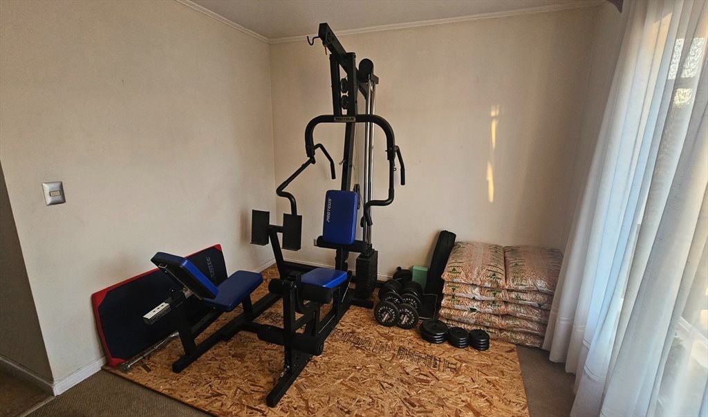 🏋️ Gimnasio en casa: Sala equipada con máquina multifuncional, banco, mancuernas y barras.
