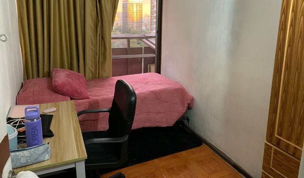 Estoy alquilando 1 habitación en un apartamento de 4 habitaciones, a segundos a pie del metro Universidad católica. El baño es compartido entre las cuatro habitaciones. Todas las habitaciones son luminosas y tienen acceso al balcón. La habitacion tiene 7 metros cuadrados y esta equipada con una cama de 1 plaza, un armario, un escritorio y una silla. La habitación cuesta 200.000 más un mes de garantía e incluye gastos comunes, electricidad, agua y internet.