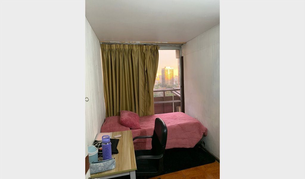 I am renting 1 room in an apartment with 4 rooms, seconds walking distance to the metro Universidad catolica. The bathroom is shared between the four rooms. The rooms has 7 square meters, is bright with an access to the balcony. The room comes with a single bed, closet, desk and a chair. The room costs 220.000 plus one month guarantee and includes common expenses like electricity, water and internet
