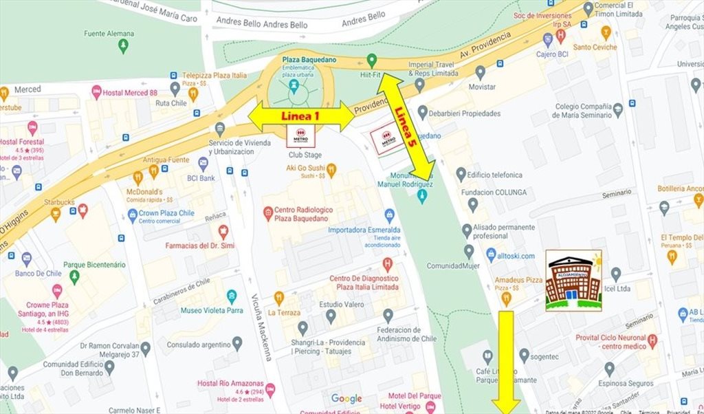 A 150 mts de la estación metro baquedano (L1 y L5) en el barrio parque bustamante en providencia: 4 habitaciones amobladas: 2 redes wifi tv cable: 2 baños con agua caliente 24 hrs: cocina, lavadora y secadora de ropa. El valor es referencial para habitación individual por 4 meses de estadía: el alquiler final varia según la habitación, modalidad de arriendo (individual o compartida), fecha de ingreso (alta o baja demanda) y duración de la estadía (uno o dos semestres); Gastos incluidos: red wifi, tv cable, agua, electricidad y gas natural con tope para consumo de energía grupal. El barrio es tranquilo, silencioso, limpio y seguro.