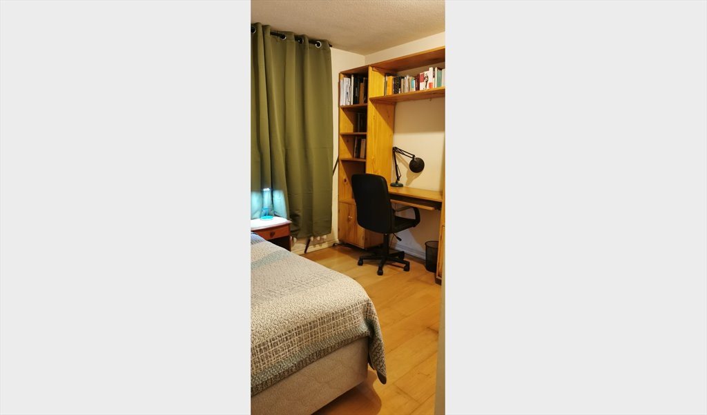 La pieza cuenta con un escritorio/librero grande con luz, cama de plaza y media, cortinas Blackout, mesita de noche con lámpara LED, espejo cuerpo entero, y un amplio clóset.