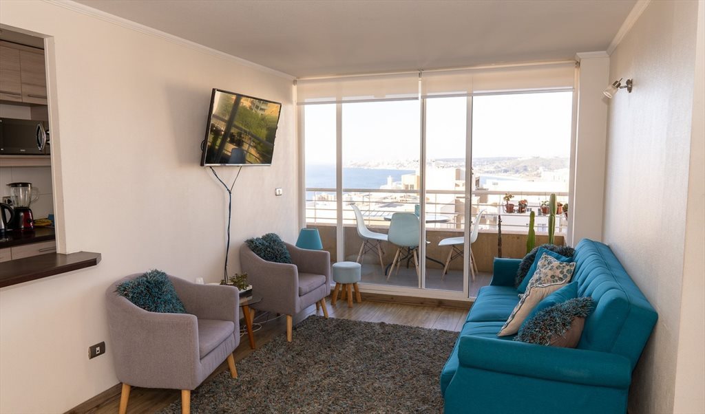 El diseño interior destaca por su cocina equipada y funcional, conectada al área de comedor y sala de estar, lo que permite una convivencia práctica y eficiente. El dormitorio principal dispone de closet ,al igual que los dormitorios secundarios cuentan con ventanas que otorgan vistas despejadas al entorno costero. Ambos baños incluyen artefactos y mobiliario funcional. Depar4tamento full equipado